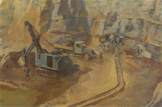 "Bagger u. Kfz u. Arbeiter im Steinbruch" Öl/Lw sign. 73 x79 cm